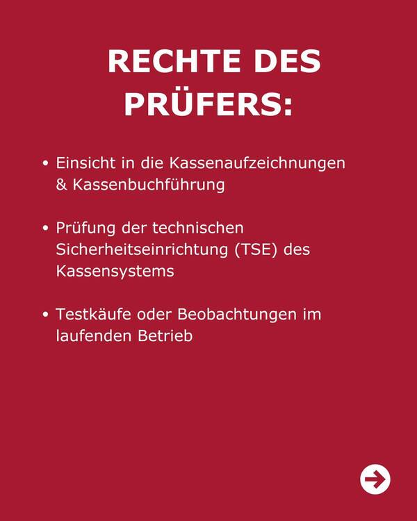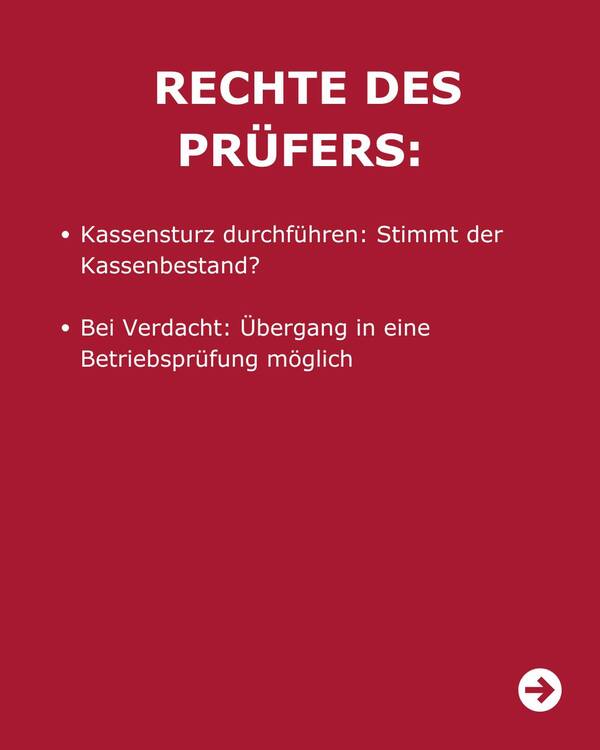 - Der Prüfer hat grundsätzlich lediglich Einsichtsrechte. Eine Beschlagnahme von Unterlagen oder Bargeld ist im Rahmen der Kassennachschau nicht zulässig.