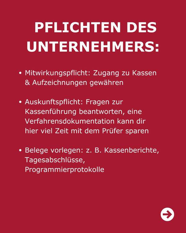 - Etwaige Kassensturz- oder Auszählungshandlungen erfolgen ausschließlich durch Sie bzw. Ihr Personal unter Aufsicht des Prüfers